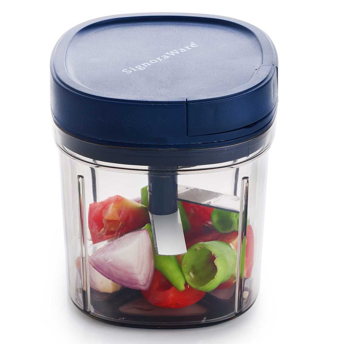 - Material Details: The SignoraWare Quick Chopper is crafted from high-quality, BPA-free, 100% food-grade plastic, ensuring safe and hygienic food preparation. The blades are made of durable stainless steel, guaranteeing efficient and long-lasting performance. The compact and lightweight design makes it easy to handle and store. Manual Operation